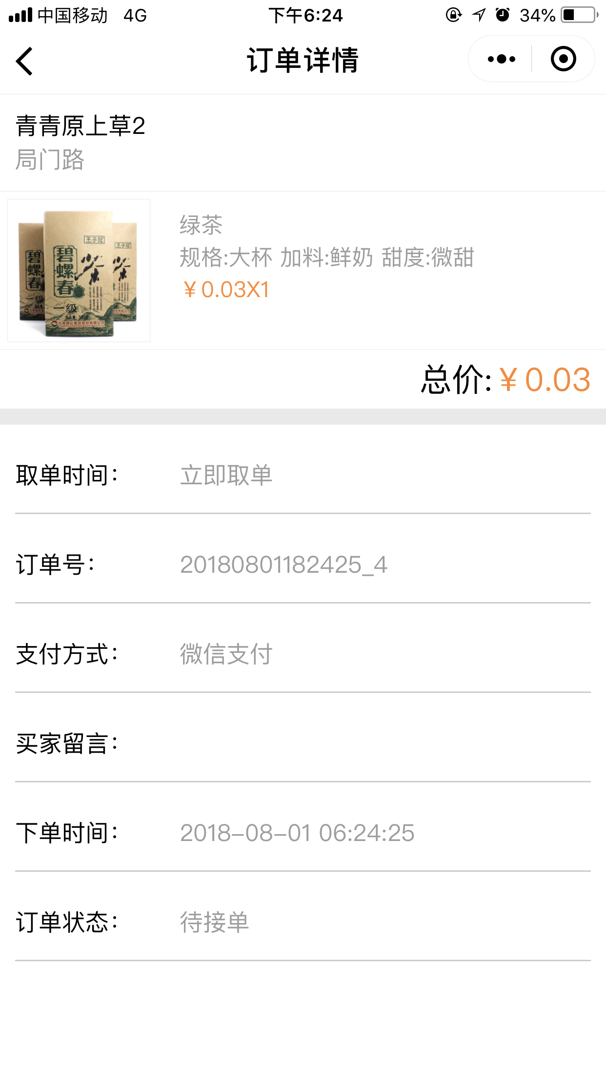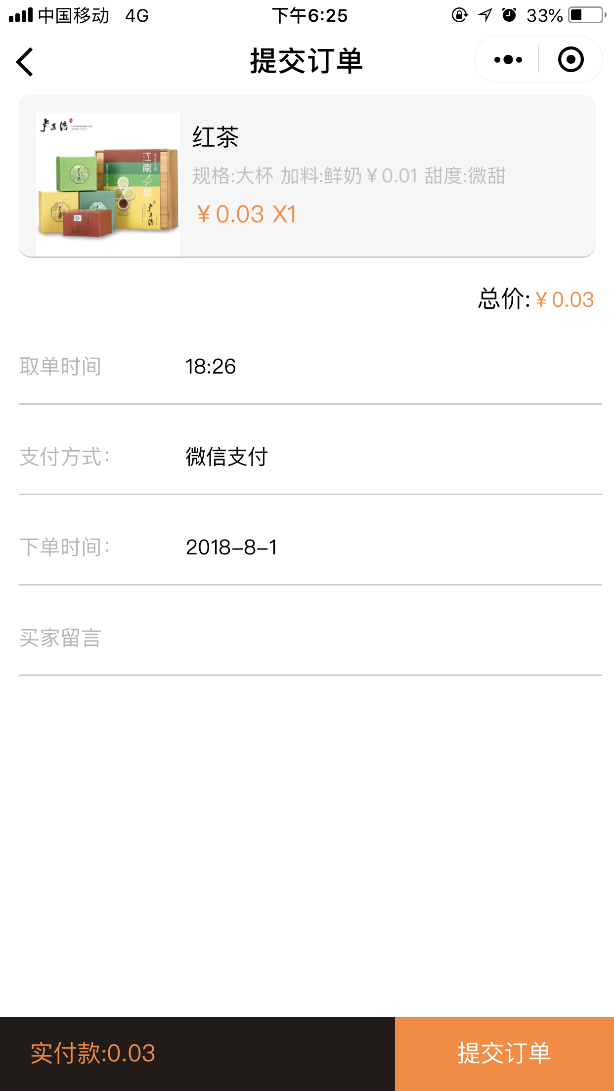 4.在前台,用户点击“开始点单”可以根据位置匹配到最近的店面,并且可以选择取餐的方式“立即取餐”或“稍晚取餐”,进入点单列表页我们添加菜品时,可以选择我们在后台添加的“配料”、“口味”、以及“规格”等,选择完毕之后,点击“去结算”跳转到提交订单页面,取单时间根据用户的选择会显示为“立即取单”或者为“取单的时间点”,提交订单后,会跳转到“订单详情”页面,当商家在后台点击“接单”接单后,会有“取餐码”显示出来,如图所示: