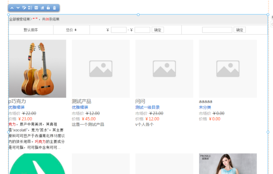 ⑥.产品搜索结果插件如下:编辑状态下,将出现如下的插件,和产品列表的某个样式一致。注意,预览情况下默认该插件是没有数据的,只能和搜索框联配合使用