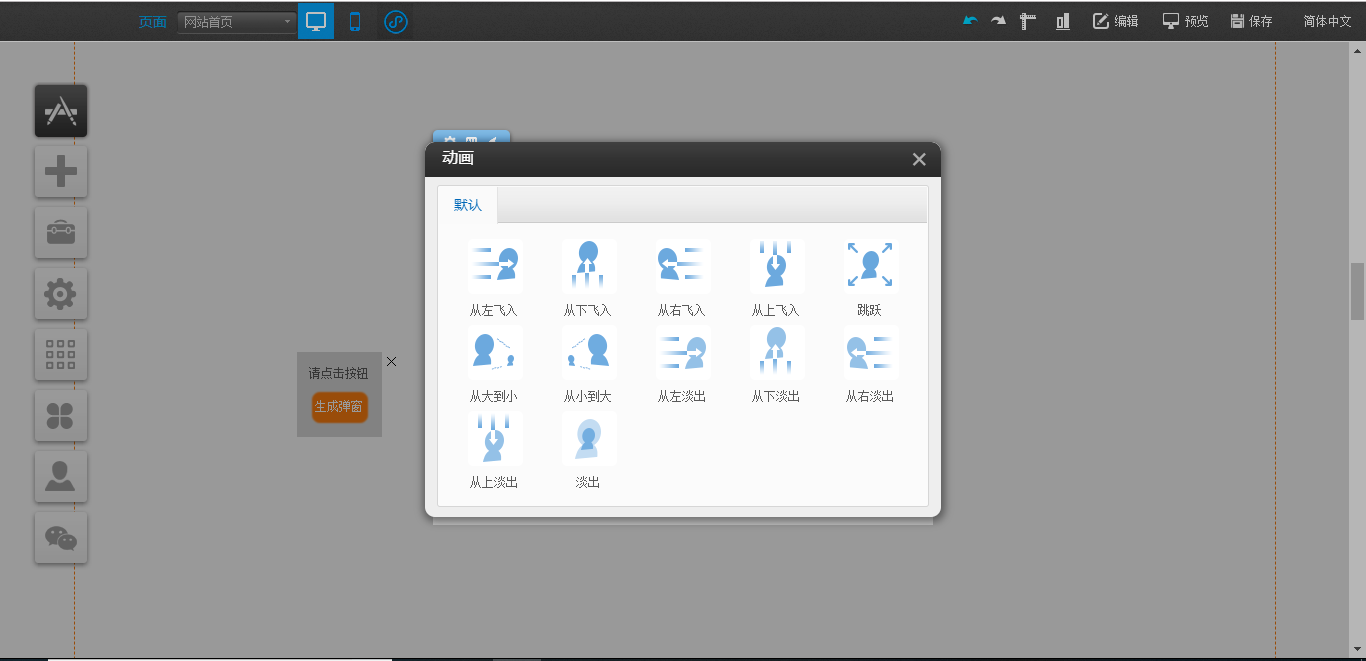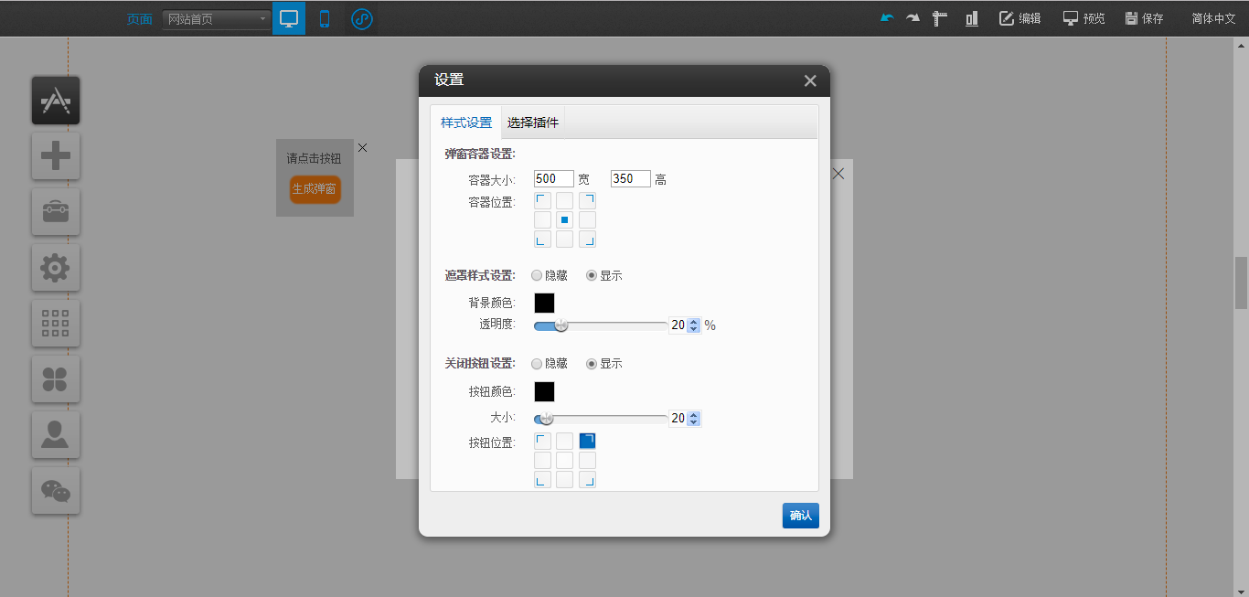 1.在PC编辑器中,点开“插件”,拖入“弹窗容器”插件,点击“生成弹窗”,在“弹窗容器”中点击“样式设置”可以对该容器的大小、关闭按钮样式以及遮罩样式进行设置,点击“选择插件”对可以拖入“文本”、“图片”、“视频”、“线条”、“站内搜索”以及“按钮”插件,“动画设置”是可以对该模块的展现形式进行设置,编辑完成后点击白色容器的“X”只是暂时在编辑器中隐藏了该编辑模块,如果需要彻底删除,需要在“生成弹窗”处关闭,并且支持将“生成弹窗”任意拖动到编辑器中的任意地方放置,如图所示: